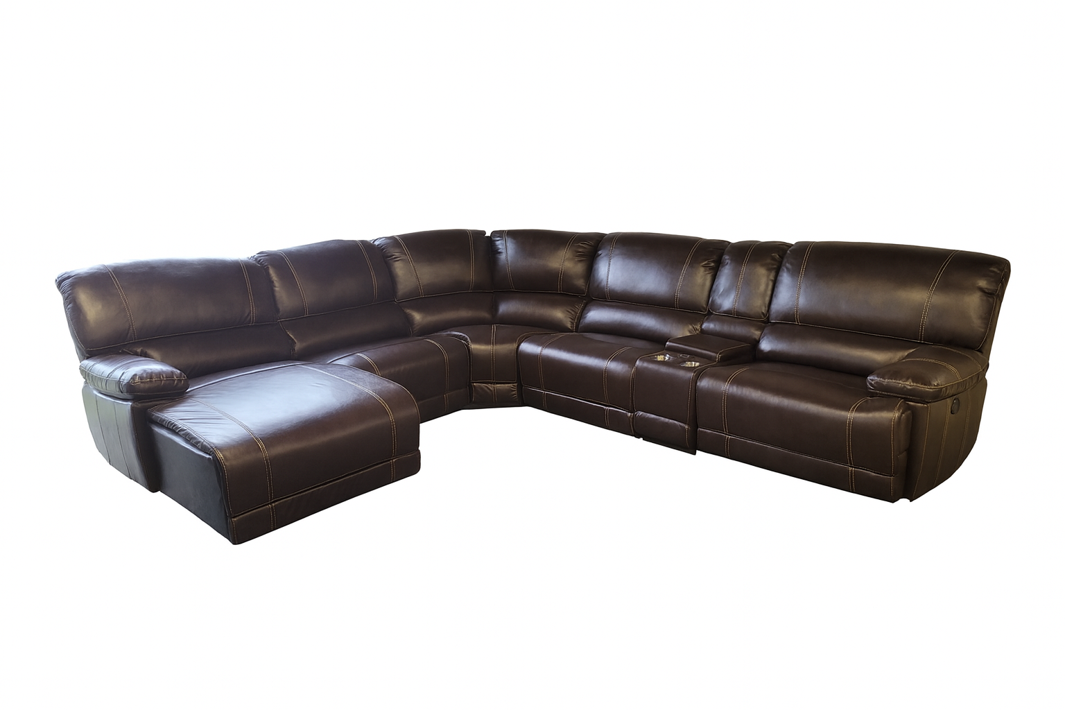 Sectional • Brown Leather Air • Steel frame • Contrast stitching • Webbing • Pocket coil springs • Steel with KD frame • Cable mechanism on recliners • Large sectional includes push back chaise, two recliners, and console with storage and cup holders